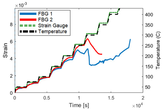 Elevated-temperature testing of two UAM-embedded FBG sensors. The strain measurements of two coupons with embedded FBG sensors and strain gauges is shown using the left scale. The temperature trace (black line) follows the scale on the right.