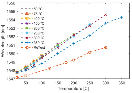 Elevated-temperature cyclic testing of an UAM-embedded FBG sensor. The FBG signal was measured during a cyclic temperature test with increasing oven set points. Once noticeable deviation occurred at 350 C, the test was performed one more time to confirm that permanent damage had occurred.