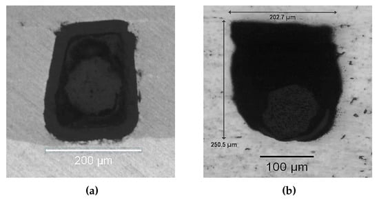 (a) Cross-section of an UAM-embedded FBG that has not undergone thermal loading and (b) cross-section of the UAM-embedded FBG that underwent cyclic thermal testing.