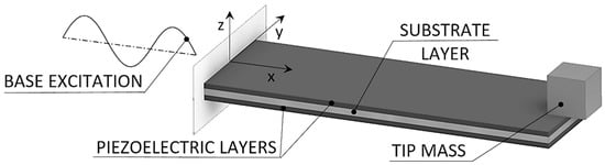 The considered device comprises thus two layers of a piezoelectric material deposited onto a metallic substrate. The resulting cantilever is fixed on one end, while a tip mass, placed on its free end, amplifies the deflections and tunes the eigenfrequency of the device to the excitation frequency. In a dynamically-excited cantilever, mechanical energy resulting from the deformation of the piezoelectric layers is converted, via the piezoelectric electromechanical coupling effect, into electrical energy, generating a voltage difference between the electrodes deposited onto the surfaces of the piezoelectric layers [,]. In the following subsections, tools intended for modeling the dynamics of such devices are thoroughly described, evidencing their respective salient features, as well as the limits of their applicability.