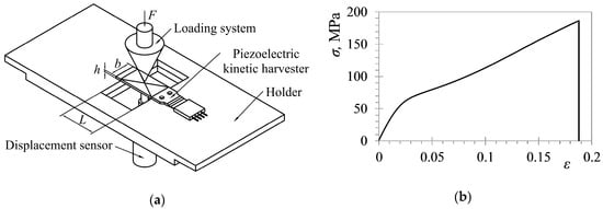 In order to apply this model, as well as to tune properly the subsequently-used, finite element (FE) models, and for interpreting correctly the results of experimental measurements, it must be noted that off-the-shelf available kinetic energy harvesting cantilevers are generally multi-layered structures comprising two or more different layers. To obtain the eigenfrequencies of such structures, their equivalent bending stiffness (expressed in terms of the product of the respective Young’s Modulus with the second moment of inertia of the cross section of the harvester (E·Iz)), needs to be determined. Tests have thus been set up on a tensile machine (Figure 2a) to measure the deflections of commercially-available harvesters while they are being subjected to a bending load. In the considered limited range of displacements, the measured load vs. the deflection data shows a linear behavior. Plate theory, i.e., the expression that correlates the modulus of elasticity of a simply supported plate to its dimensions, and to the deflections induced by centered bending point loads, hence allows the determination of the equivalent Young’s Modulus value []. Another approach is to use a conventional quasi-static tensile test to measure the Young’s Modulus of the multi-layered piezoelectric harvester from the resulting stress-strain curve (Figure 2b) [].