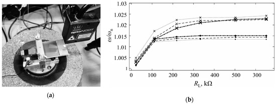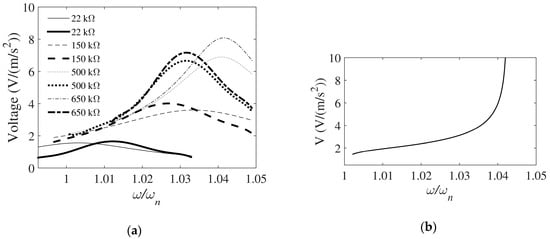 From the frequency response functions (FRFs) of steady-state voltages vs. harmonic base acceleration (expressed as a ratio with respect to the uncoupled, i.e., pure mechanical, eigenfrequency ωn) for varying applied electrical loads RL (Figure 5a), it can also be concluded that not only an increase of RL causes a marked nonlinear increase of the amplitude of the maximal output voltages, but also that the influence of the backward piezoelectric effect on the dynamical response is significant. This hardening effect leads, therefore, to an increase >4% of the modal frequency where the output voltages are maximal, with respect to the uncoupled eigenfrequency of the same harvester (Figure 5b) [].