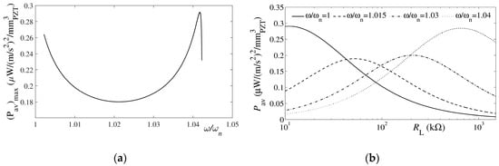 Considering, in turn, the FRFs of the achieved average powers (normalized to the volume of the piezoelectric material) vs. base acceleration, a good correspondence of the general trends and the maximal values obtained experimentally and by using the CMEDM is obtained again, while the obtained dependence of the maximal powers vs. the normalized excitation levels is complex and not monotonic. In Figure 6a it is thus evident that, after an initial decrease of the maximal average power with increasing RL, an increase and then a secondary decrease occurs. This nonlinear dependency allows the optimal load (i.e., the load resistance allowing to attain the maximal power) to be determined for a specific piezoelectric kinetic harvester. In this frame, however, it has to be noted that several RL values, depending on the excitation frequency, can result in the same value of the maximal average specific power. Considering then the whole theoretically possible range of loads applied to a specific harvester, the lowest RL values will give maximal average specific powers for excitation frequencies corresponding to the short circuit condition, while the highest RL values result in maximal specific powers for frequencies approaching the open circuit condition; intermediate excitation frequencies result, in turn, in smaller maximal specific average powers even for optimized RL values (Figure 6b). What is more, for increasing RL values a nonlinear hardening effect leads once more to an increase >4% of the modal frequencies where the values of the maximal specific powers are obtained [].