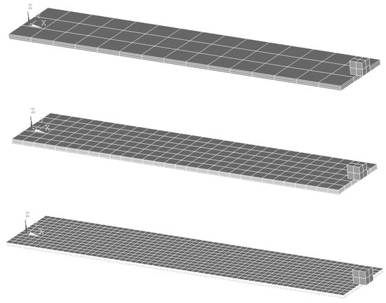 A mesh sensitivity analysis is performed next, using three mesh densities, each with a twofold increase in density with respect to the previous one (Figure 7), and the obtained results are compared with those obtained via the CMEDM model. It can thus be shown that, regardless of the considered mesh density, that the eigenfrequency resulting from the FE modal analyses results in negligible errors (<1%) with respect to the first bending eigenfrequency obtained via the CMEDM approach. This implies that, in general, FE modal analyses can be performed with a coarser mesh [].