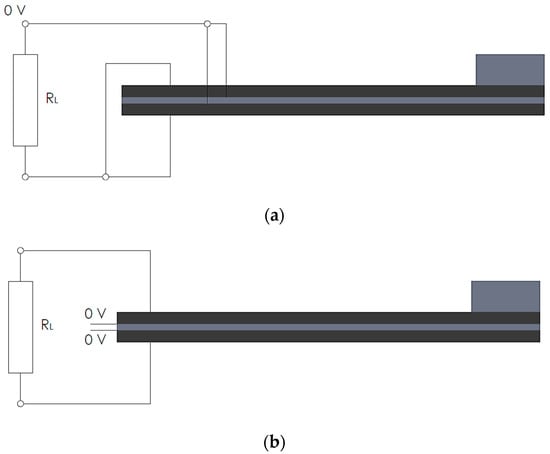 As shown in [], parallel or serial connection can be proficiently used in this frame, depending on the polarization of the piezoelectric layers. In the case of a parallel connection, the outer nodes of the piezoelectric layers are to be connected to one end of the resistor element, while the inner nodes (in contact with the metallic substrate) are connected to the other end, thus completing the circuit (Figure 8a). One of the load resistance nodes has to be connected to ground []. When, in turn, a serial connection is considered, the outer top nodes are connected to one end of the resistor, while the outer bottom nodes are connected to the other end. The nodes adjacent to the metallic substrate have to be connected to ground (Figure 8b) []. The output voltage is then measured on one of two nodes representing the connectors of the resistor.