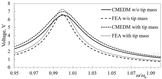 By varying the excitation frequencies and the applied resistive loads, it is hence proven that the FE model allows a satisfactory (with relative errors generally <1%) prediction of the rise of the eigenfrequencies with increasing resistive loads induced by the backward coupling hardening effect (Figure 10b). The small visible deviations of the FE model results with respect to the experimental data can perhaps be attributed to previously evidenced ANSYS® limitations in performing this type of simulation, due apparently to the theoretical formulation of the direct piezoelectric effect adopted in the ANSYS® software package []. On the other hand, however, the voltage level discrepancies between the FE and the experimental data are larger, especially for larger tip masses and electrical loads, which requires a further thorough investigation [].