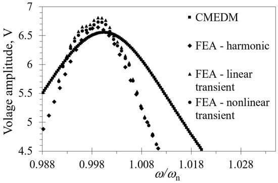 The optimal value of the RL electrical resistive load (i.e., the one resulting in the highest power outputs) is then determined by performing a number of harmonic analyses while varying the RL values in a range covering several orders of magnitude (from the Ω up to the MΩ range) [,,]. From the comparison of the FRFs of harmonic analyses with those attained again by using CMEDM, an excellent correspondence is hence attained once more (with relative errors of maximal voltage outputs and respective eigenfrequencies <1%), confirming the suitability of the FE model in successfully forecasting the electromechanical coupling (including the backward coupling effect) and its influence on shifting modal frequencies (i.e., the hardening effect previously evidenced via CMEDM calculations) (Figure 9) [,].