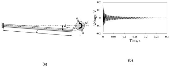 The frequency up-conversion mechanism consists of plucking the free end of the piezoelectric kinetic harvester by plectra mounted on a rotating body and allowing it to oscillate freely at its eigenfrequency (Figure 12a). In this way, the harvester operates at its optimal working conditions, which results in the highest possible voltage (and power) outputs, allowing it to generate up to ca. 2 mW of power []. The transient response can in this case again be analyzed numerically by employing an ANSYS-based FE modeling of the deflection of the piezoelectric kinetic harvester resulting from the impact of the plectrum, while the respective excitation profile can be modeled via the MATLAB® software package as an impulsive load inducing the free vibrating response shown in Figure 12b [].