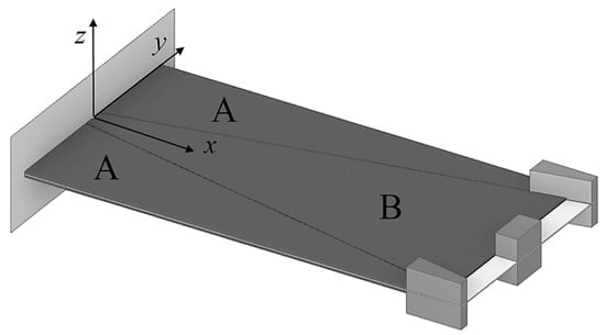 In order to maximize the power output of a piezoelectric kinetic wearable harvester with a predefined limited surface area, and thus reduce the overall size of the device considered in the frame of this work for powering medical sensors, the conventional rectangular surface of the harvester (indicated with “R”) is therefore divided in Figure 14 into two trapezoidal (A) and one inverse trapezoidal (B) segment [,]. The considered thicknesses of the substrate and of the piezoelectric layers, as well as the tip masses are in turn equal in all studied bimorphs.