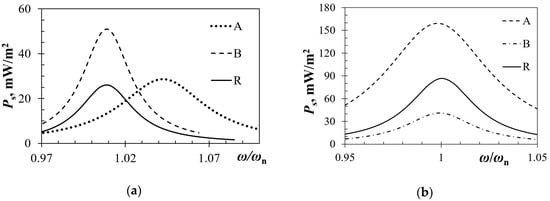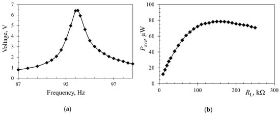 where j is the imaginary unit (), ω is the excitation frequency close to harvester’s eigenfrequency, which itself is ωr, and next, κr is the forward coupling term, σr is the translational component of the excitation, ζr is mechanical damping, RL is the external electrical load acting on the system, is the capacitance of the piezoelectric material and is the modal coupling term []. The average power output of the harvester, dissipated across the resistor, will then be given by: