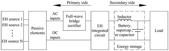 The characteristic wearable devices listed in Table 1 require stabilized direct current (DC) power signals in order to operate properly. The typical operating voltages of such loads are converging to standardized values of 3.3 V or 5 V DC [,,,,,,,,,,,,,]. The voltage outputs from the energy harvesting devices, on the other hand, depend on the principle used to collect the low-level energy. In cases when, for example, the energy harvesting device uses a DC actuator as an active element [], DC voltage with variable amplitude (depending on the velocity of actuator’s rotor) is present at its output. In the case herein considered, due to the excited bending of the cantilever bimorph induced by the kinetic energy of vibrations, the optimized segmented piezoelectric kinetic energy harvesters described in the above treatise generate at their outputs an alternating current (AC). This current could be characterized, depending also on the foreseen sensor powered by them, not only by varying amplitudes, but also by differing frequencies. Taking this into account, the harvested energy has to be properly managed to attain a smooth and stabilized voltage supply that can be interfaced to the considered load (medical sensor with signal processing and communication components). A further task designated to such electrical circuitry is to manage the surplus energy when it is produced, but the sensors and the respective data elaboration and transmission electronic components are in a dormant state, i.e., to store such energy on a suitable storage element (i.e., a capacitor [], a rechargeable battery or a super-capacitor []), so that it can be efficiently delivered to the load when needed. By using the storage element, short power bursts can be achieved as well, i.e., high amounts of energy can be delivered to the load in short periods of time, as is commonly needed, especially for the data logging and data transmission components in some of the aforementioned wearable medical applications.