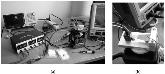 Such approaches have been applied to an off-the-shelf class of piezoelectric kinetic harvesters (Figure 4), and the results attained via the CMEDM implemented in MATLAB® [,] have been compared with those obtained experimentally on specifically developed set-ups at the Precision Engineering Laboratory of the Department of Mechanical Engineering Design of the Faculty of Engineering of the University of Rijeka, Croatia []. It has been shown that, in terms of the general trends related to the dynamical responses for variable electrical loads, as well as of the achieved peak voltages at a determined eigenfrequency, CMEDM provides reliable results for bimorph cantilevers with a constant rectangular cross-section, although there are residual discrepancies, probably due to nonlinearities (anticlastic effect [], geometrically nonlinear deflections [], compliance of the constraints) un-included in the CMEDM.