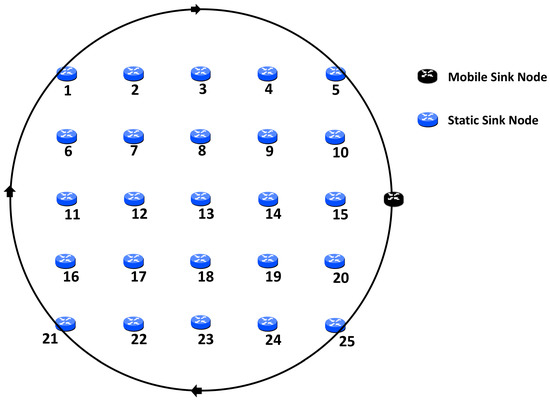 In reference to the simulation parameters in Table 1, the simulation time is calculated to ensure an exact number of circuits of the network by the MSN. As such, with the speed at 2 mps (meters per second) the sink shall complete exactly 2 circuits of the network, for 10 mps, 10 circuits and so on.