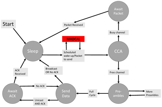 The MADCAL algorithm is implemented at the MAC layer, where the greatest amount of energy is consumed amongst network layers [35]. The MAC implementation utilised in this study is a lightweight carrier-sense multiple access (CSMA) implementation which reflects the core functionality of the IEEE 802.15.4 standard [36,37]. This uses CCA and the transmission of preambles. Figure 3 demonstrates this MAC implementation, with the location of the MADCAL functionality highlighted to show how the normal wake-up schedule is intercepted.