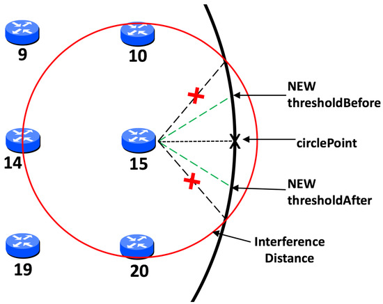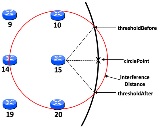 With circular mobility, this threshold is calculated based on the angle of the closest point to the circular path in relation to the static node—the circlePoint. Taking into account the interference range of the node and the radius of the circle, an initial maximum threshold before and after the circlePoint can be calculated. This is demonstrated in Figure 4 in relation to node 15. However, a simplistic approach such as this would result in a significantly large threshold if the static node is close to the path of the MSN. In this event, this node could monopolise communication with the sink for a considerable time, to the detriment of other significant nodes. To negate this, a more dynamic approach to calculating the threshold is required. Firstly, node distance to the sink path is taken into consideration and divided by the interference distance, in order to create a factor by which the threshold angle shall be multiplied. Secondly, in order to now avoid an extremely small threshold for nodes closer to the path, a factor check is utilised. This lessens how much the threshold is reduced based upon the speed of the sink node, which is constant throughout each scenario. It was found, via simulation, that as the sink speed increases a smaller threshold is more efficient, given that the sink shall pass through this threshold more often. For example, in our experiments, if the sink node is travelling at 40 mps it shall pass through the threshold of any significant node 40 times in each scenario, giving each significant node many opportunities to communicate with the sink. However, if the sink node is travelling at just 2 mps it shall only pass through the threshold of each significant node two times in each scenario. In this case, it would make sense for thresholds to be larger to give each significant node as much chance as possible to communicate with the sink.