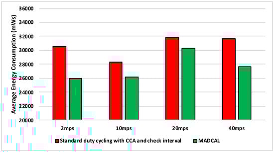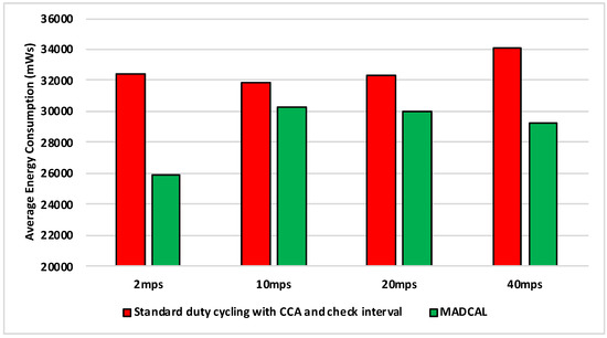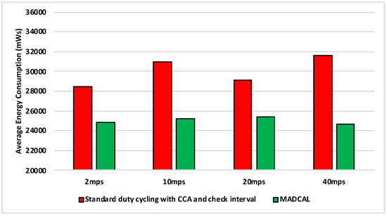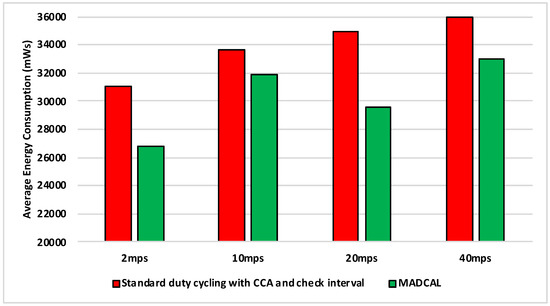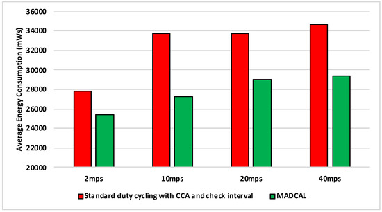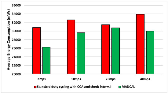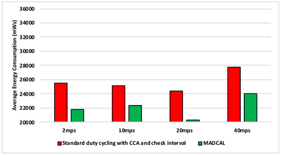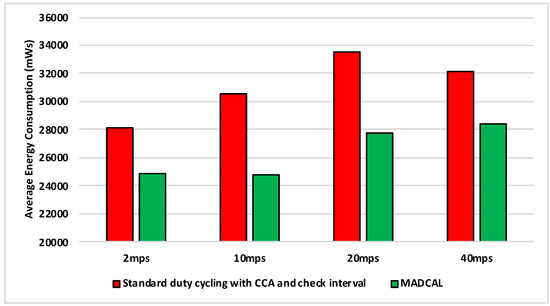 Figure 17 is significant in that the interference range is now strained to a great extent. However, benefits can still be seen with MADCAL in use. As with the grid topology, this is less evident when the sink is moving faster. However, unlike in the equivalent test, shown in Figure 9, the benefits in energy consumption are greater overall now.