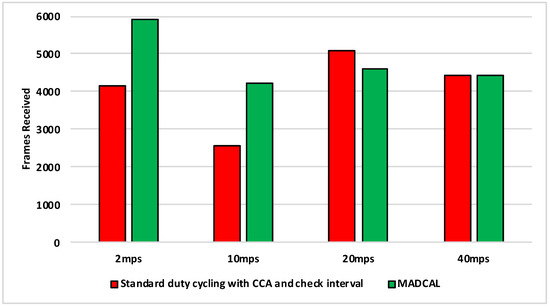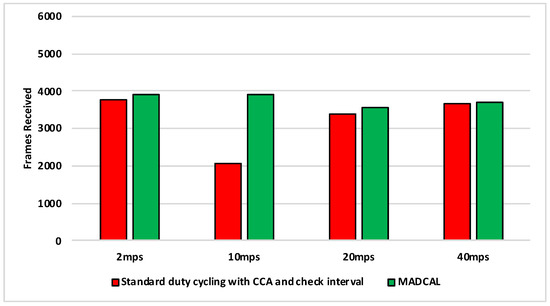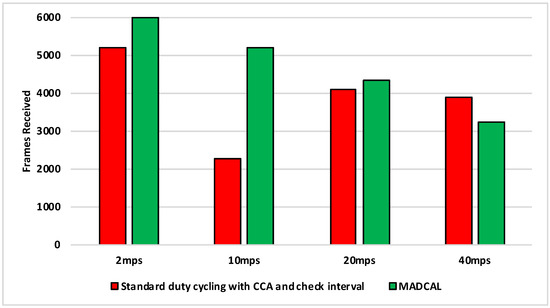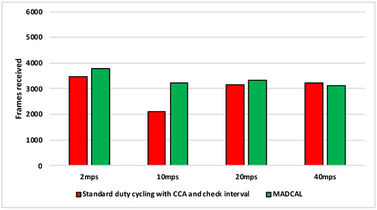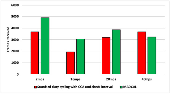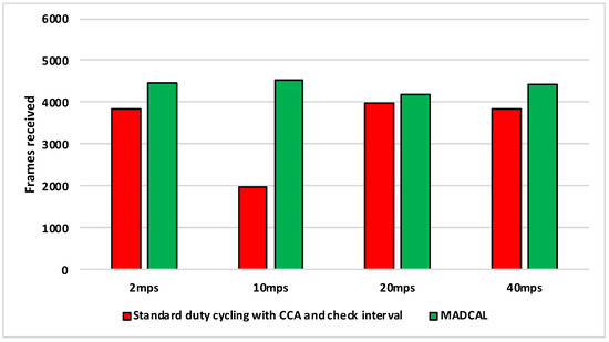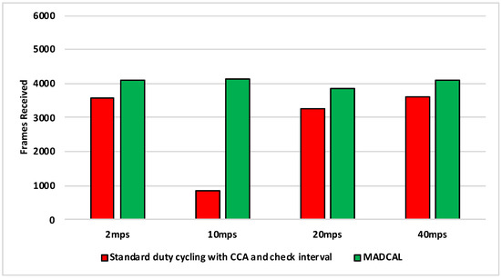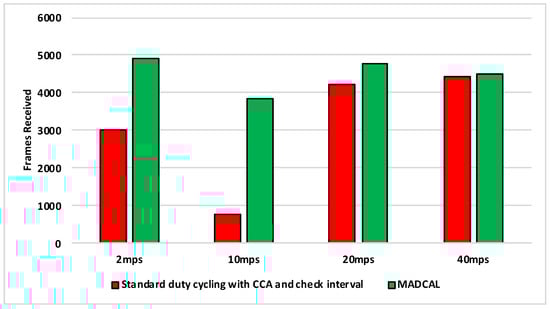 Of interest in Figure 18 is that it can be observed that MADCAL brings the frame reception into line across all different speeds in this scenario. While 10 mps was previously significantly lower than the other speeds in this regard, it was not so when MADCAL was in use. This also occurred when the topology was more controlled, but only once interference ranges became much smaller.