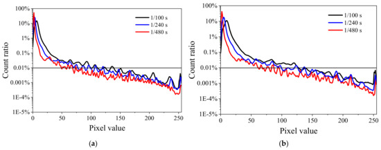 Distribution of the count fraction of pixels at a dose rate of 51.61 Gy/h and (a) a gain of 6 dB and (b) a gain of 42 dB in frames captured at using integration times ranging from 1/8000 to 1/25 s.