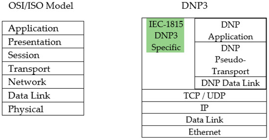 The DNP3 plays a vital role in the smart grid, and it is conventionally used in SCADA industrial processing, including both electricity and water distribution. For this reason, in this paper we focus on this protocol due to its importance in smart grids. The DNP3 protocol is based on a three-layered, enhanced performance architecture (EPA) reference model. The EPA defines the basic application functionality for the user layer, which is located between the OSI App Layer and App Program [6,7]. According to Figure 1, the DNP3 protocol mainly consists of three layers: the application layer, the data-link layer, and the pseudo-transport layer. The DNP3 protocol facilitates reliable communication between the SCADA nodes; for example, the last layer is in charge of the transmission of enormous quantities of data [8,9]. The proposed research emphasizes the DNP3 protocol by parsing its structure during the session, and we will develop an algorithm to analyze the vulnerabilities that will include modeling attacks on all layers, and we propose an intrusion detection system to detect those attacks.