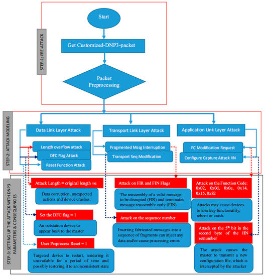 - Step 1: Pre-attack. This is where the preliminary is carried out, including obtaining the DNP3 packets from the repository, and preprocessing the packet in order to obtain three layers for the next step.