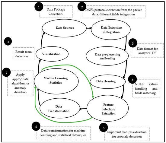 - Steps 2 to 4: After getting the raw data, the engine proceeds to DNP3 protocol extraction with the integration of various fields with pre-processing actions such as contextualization and mapping in order to prepare for loading to the DB. Before that, the engine carries out the data cleaning, removing unwanted fields, carrying out de-noising, and nullifying some fields that match with the DB used in our experiment.
