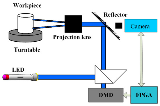 The overall design of the visual imaging of an adaptive illumination method is shown in Figure 1 First of all, a collimated LED light source is incident on the total internal reflection (TIR) prism, and the incident light is reflected by the triangular prism and illuminated vertically on the DMD. Then, the reflected light (adaptive stripes with spatiotemporal modulation) modulated by DMD is projected through a triangular prism, mirror and projection lens onto a workpiece with a high reflective surface, and a uniform illumination is formed on the workpiece surface to highlight the defect information. Finally, the image acquisition module is used to capture the defect information of the workpiece surface to be measured.