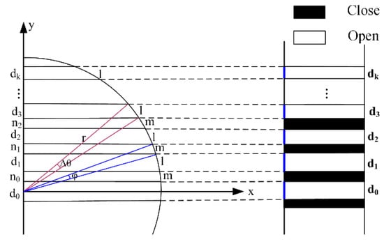 A two-dimensional rectangular coordinate system x-y is established with the center of the cylinder as the coordinate origin, as shown in Figure 4. According to the minimum defect detection and projection model, 1 is the arc length of bright stripes, m is the arc length of dark stripes and R is the radius of a cylinder. In the rectangular coordinate system, the first bright stripe arc length is divided equally by the X axis. In addition, d0~di refers to the width of bright stripes projected by the established model and n0~ni refers to that of dark stripes. ∆θ is the arc angle corresponding to the arc length of bright stripes and is the arc angle corresponding to the arc length of dark stripes.