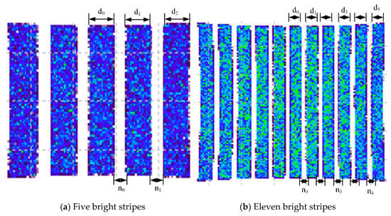 For the verification of the uniformity algorithm of stripes, in the first group, it is assumed that the radius of the cylinder is 40 mm, and five bright stripes with equal arc lengths are projected on the surface of the cylinder with a central angle of 2° but of 1° of dark stripes. Based on the focal length and magnification of the convex lens, the width of the DMD stripe light source is controlled and the illumination diagram of the cylindrical surface is as shown in Figure 5a, where the theoretical value of d and the actual width of each stripe are presented in Table 1. The second group assumes that 11 bright stripes with equal arc lengths are projected on the surface of the cylinder. The central angle of bright stripes is 1°, while the angle of dark stripes is 0.5°. According to the focal length and location of the convex lens, the width of the DMD stripe light source is controlled and the illumination diagram of the cylindrical surface is as shown in Figure 5b, where the theoretical value of d and the actual width of each stripe are as presented in Table 2.