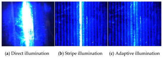 The measured cylindrical workpiece with a radius of 40 mm is properly placed in the experimental platform. First and foremost, the LED light source illuminates the cylinder workpiece being inspected, and the surface image of the cylinder with a high reflection is captured by the digital camera. As Figure 9a shows, the image contains large areas of halo and the over exposure of light intensity, and the defects are concealed. Then, the uniform straight stripe light is projected onto the surface of the cylinder under examination, and the surface image captured by the digital camera is shown in Figure 9b. Compared with the workpiece surface not illuminated by the stripe light, the halo phenomenon is obviously reduced, but the normal direction of the target surface of the digital camera is still overexposed, which causes the defects in the central bright stripe to be concealed. At last, illuminated by the adaptive modulation scheme of light intensity shown in Section 3 of this paper, the image captured by the digital camera is shown in Figure 9c, which eliminates the halo and light intensity overexposure phenomenon and causes the defects to appear completely.