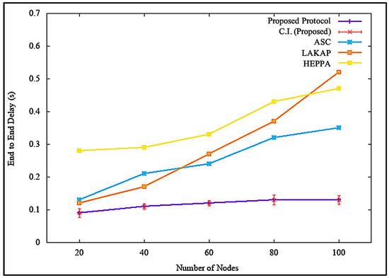 Figure 14 shows the simulation results of end-to-end delay incurred by the network when there was no attack executed. Figure 14 shows that the proposed solution incurred a steady, lower end-to-end delay with a difference of 0.12 s, 0.30 s, and 0.08 s as compared to ASC, LAKAP, and HEPPA, respectively. LAKAP showed a significant hike in end-to-end delay when the number of nodes as increased from 60 to 80 compared to the rest of the three solutions. In terms of statistical analysis, the proposed solution resulted in an average end-to-end delay of 0.13 s, standard deviation of 0.018738, and a confidence interval of 0.013404 with 100 nodes in the network. Overall, the proposed solution incurred a lower and steadier end-to-end delay because of the lightweight hashing technique with sponge construction, which relies only on single permutation. This implies that the data packets were processed in a shorter time.