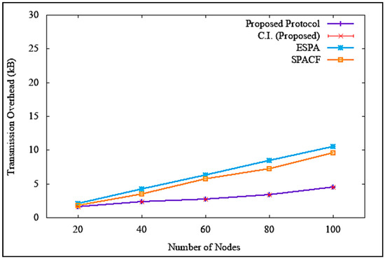 Equation (4) shows the formula of transmission overhead calculation, where denotes transmission overhead, denotes overhead bytes, and denotes the total number of bytes in a transmission. The results of transmission overhead when the attacker or malicious node was non-existent are illustrated in Figure 18, which clearly shows that the transmission overhead increased with an increase in the number of nodes. However, it is clear in the figure that the proposed solution incurred a much lower transmission overhead, with a difference of 6 kB and 5.1 kB as opposed to ESPA and SPACF, respectively. At 100 nodes, the average transmission overhead was 4.5 kB, with a standard deviation of 0.149443 and a confidence interval of 0.106905. Similarly, when there was an attack, as shown in Figure 19, the proposed solution incurred a steady increase in transmission overhead as compared to ESPA and SPACF, suffering a drastic increase in transmission overhead, with a difference of 15.5 kB and 7.6 kB, respectively. At 100 nodes, the average transmission overhead was 5.0 kB, with a standard deviation of 0.207913 and a confidence interval of 0.148722. The proposed solution incurred a lower transmission overhead compared to the benchmark protocols because of its implementation of a signatureless public key infrastructure authentication technique to maintain a lighter and shorter packet header.