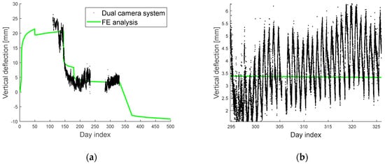 A total of 34,468 measurements were obtained for about nine months, beginning on 4 January 2018. Figure 5a shows the measurement data and the FE analysis results for the vertical deflection. Due to a malfunction in the dual-camera system, sensor data were not obtained from 10 May (day index 235) to 25 June (day index 281) 2018. The FE analysis results (represented by the green line) considers the construction schedule and the associated physical phenomena, and thus, it follows the trend of the measurements by the dual-camera system represented by black dots. However, the FE analysis can provide only a long-term deterministic prediction, without daily fluctuations, as shown in Figure 5b, which is a magnification of a portion of the plot in Figure 5a. Moreover, it is observed that the FE analysis results have a bias. That is, the FE analysis result cannot exactly predict the vertical deflection alone due to its model error.