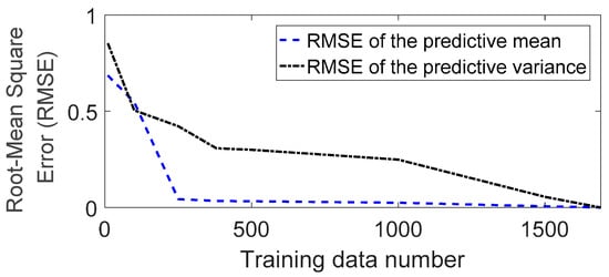 The proposed method is applied to build probabilistic prediction models, and the flow chart, shown in Figure 6, summarizes the procedure. First, data are processed with the measurement data according to the FE model. Second, the SoD approximation is applied to reduce the computational cost. In this application example, a convergence test of the SoD approximation was conducted for the full set of 1690 data, and Figure 7 shows the results. It is observed from the figure that the root mean square errors (RMSEs) of predictive mean and variance decrease with the increasing amount of considered data. Based on these results, the minimum number of SoD was selected to be 400. Next, kernel hyperparameters were determined through an optimization procedure using SoD, and the predictive mean and variance were calculated.