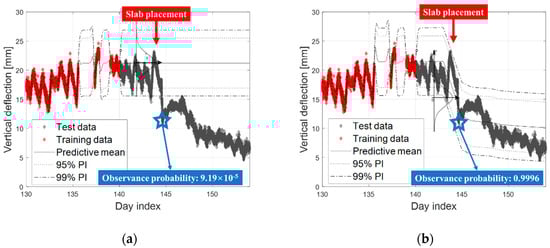The measurement data from day index 109 to 140 is used, and the prediction results with, and without, the use of the FE analysis results are presented in Figure 8a,b respectively. It is seen in both of the figures that, until day 145, the actual measurement data on the vertical deflection are primarily located within the 99% prediction interval (PI). In Figure 8a, however, the measurement data are outside the prediction interval on day 145, when the slab was placed. This is because the slab placement produced a large downward deflection on the target girder, and it could not be considered without the FE analysis. As a result, the predictive mean and standard deviation of the vertical deflection are estimated to be 20.849, and 2.099 mm, respectively. However, the actual measurement on day 145 was 12.64 mm. Using the normal distribution assumption on the vertical deflection in GPR, the probability of observing at least the level of deviation from the mean is calculated to be 2×Φ(−|12.64−20.849|/2.099) = 9.19 × 10−5, where Φ(∙) is the standard normal cumulative distribution function (CDF), which indicates a very rare event. On the other hand, when the FE analysis result is used for the probability prediction, the predictive mean and standard deviation are estimated to be 12.639 and 2.364 mm for day 145, and the probability of observing at least the level of deviation from the mean is calculated to be 2×Φ(−|12.64−12.639|/2.364) = 0.9996, as shown in Figure 8b, which indicates a very probable event. These probabilities can be used for effective bridge management.