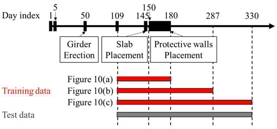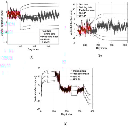 Similarly, predictions are made using measurement data for longer periods, as described in Figure 9, by employing both, the measurement data and the prior prediction from the FE analysis. According to a previous study [], measurement data, obtained for approximately three months, were necessary for an accurate prediction on bridge deflection when considering environmental effects. If sufficient training data are not available, environmental effects can be considered in the prediction through their introduction into the FE analysis. However, this is not within the scope of this study. The prediction model in Figure 10a is constructed using the measurement data between the day indices 109 and 180, and the model in Figure 10b utilized the data between the day indices 109 and 287. First, Figure 10a, which describes the deflection after the placement of the protective walls shows that the vertical deflection after the protective wall placement is within the expected range. Similarly, Figure 10b shows that the deflections are within the acceptable ranges, which means that the construction has proceeded as expected. Finally, the long-term deflection prediction model was constructed using the entire measurements from day indices 109 to 330, as shown in Figure 10c.