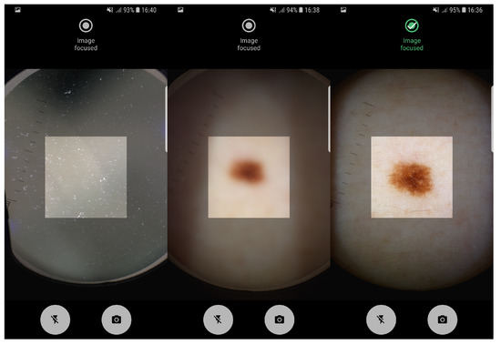 The proposed pipeline in this study, involving artifact detection, preview and taken image assessment was already deployed in an Android application running on a smartphone. The application allows the manual acquisition of dermoscopic images in an easy and intuitive way, providing real-time feedback about the level of focus of the images being acquired. In Figure 4 it is possible to observe the feedback provided by Preview Image Assessment module. Moreover, usability tests on the application interfaces design were already made and reported in Reference [31]. Additionally, the proposed solution was designed not only to evaluate the image quality of mobile-acquired dermoscopic images, but also the focus level of each preview frame in real-time, in order to guide the user during the acquisition process. Given the reported running times on both low-end and high-end devices, we can also conclude that the proposed approach is computationally suitable for real-time usage on mobile devices.