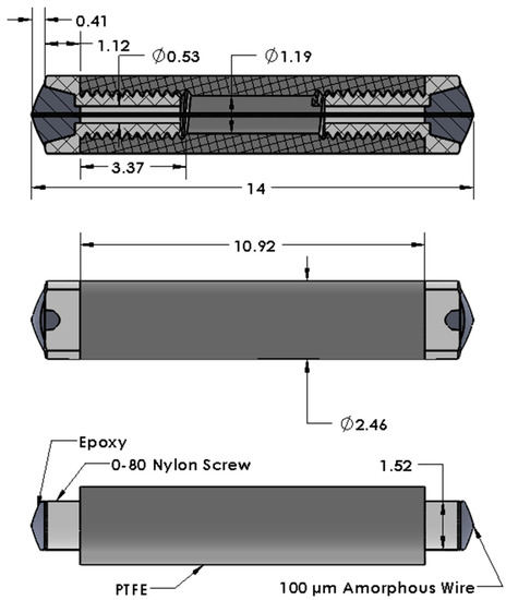 The main challenge in sensor fabrication is securing the magnetoelastic wire to the RSM. The choice of Teflon as the response material is a complicating factor because conventional adhesives cannot be used to directly bind the wire to it. Several methods for building sensors were tested, but most were discarded because of high failure rates. The best solution involved fastening the wire to small nylon screws on each side of the RSM. In addition to providing surfaces compatible with epoxy, the screws were used to impose a variable stress upon the wire. The procedure is straightforward but requires some precision. A 1.07-mm hole is drilled through a PTFE plate on a small drill press. The drill bit is then replaced with a section of 3.02-mm-diameter stainless-steel tubing, with one end of the 0.254-mm wall sharpened to serve as a hole saw, and a concentric cut is made in the plate. After the tubing is extracted, the PTFE plug is removed, trimmed to the desired length, and tapped with a 0–80 thread on each side to a depth of 5.08 mm. Size 0-80 nylon screws with a 3.18-mm-long threaded section (McMaster-Carr, P/N 94735A701) are fully turned into the RSM. The screws have a 1.59-mm hole drilled through the centerline. One screw is then reversed 1/16th of a turn to provide a means of varying tension on the wire. A 75-mm length of 100-micrometer-diameter SENCY wire is inserted through the nylon screws, and a stop made from a blob of Hardman DOUBLE/BUBBLE Epoxy Red is deposited about 25 mm from one end of the wire. Additional blobs of epoxy are worked into the joints between the nylon screws and the wire by repeatedly moving the wire backward and forward, with care taken to limit the dispersion of the epoxy only to the sections of wire in contact with the screws. The assembly is hung vertically, with the stop on the bottom, using a set of clamps and weights that place the wire under 100 gram-force of tension while the epoxy is curing. The sensor body rests against the stop during the curing process. After the epoxy has cured, the excess wire on both sides of the device is cut and filed flush with the epoxy surface. Figure 1 displays schematics of the finished sensor.