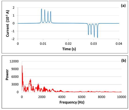 Figure 3a displays a current versus time plot tracing typical magnetic switching signals from an array of four sensors. The current data were measured in the detection coil and are in the range of tens of milliamperes. Current-based, low-impedance measurements were performed because it was possible to ignore the capacitance in the cable connecting the detection coil to the instrumentation package. Voltage-based, high-impedance measurements could also have been made, but in this case the cable capacitance would have degraded the frequency response. The plot has one positive and one very similar negative peak for each wire, corresponding to the oscillations of the magnetic domains as they follow the drive field. The response curve typically contains remnants of the drive field that are not removed by the cancellation coil. To ensure that these artifacts do not alter the peak heights, they are fitted to a sine function and subtracted from the baseline. During data processing, the absolute values of the magnitudes of the positive and negative switching peaks are averaged, and the response of each sensor is reported as the difference between the averages obtained before and after exposure to radiation. A total of 512 cycles are averaged for each reported current value. As will be discussed in Section 3, the four sensor positions have different gains, so the response of a sensor is averaged across all positions. Figure 3b presents the Fourier power spectrum of the time record in part (a) and will be discussed in Section 3.