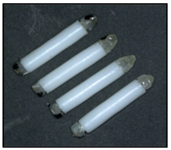 Two sets of sensors were built for the performance evaluations. The first set (S1, Figure 4) consisted of four sensors prepared according to one of the original assembly methods, with lengths in the range of 15.0 ± 0.2 mm and diameters in the range of 2.45 ± 0.05 mm. Two of these devices, along with a replacement, failed when additional loading was attempted by twisting one screw 1/16th of a turn counter-clockwise. The remaining two sensors, designated S1.1 and S1.4, were loaded successfully. S1.1 was subjected to radiation exposures, and S1.4 was used as a control. The second set of sensors (S2) was assembled following the procedure in Section 2.3 and consisted of six devices with lengths of 14.0 ± 0.3 mm and diameters of 2.45 ± 0.05 mm. All sensors in this group, designated S2.1 to S2.6, were intact. Sensor S2.5 was used in the performance tests, with S2.1 as control. S2.6 was employed as a control for S1.1 after the adhesive joint in S1.4 failed; at that point, the dose in S1.1 from two exposures amounted to only about 1 Gy. The control sensors were not irradiated and were mainly used to account for the temperature sensitivity described at the end of the last section.