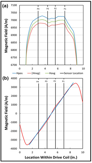 To visualize the magnetic environment of the sensors, the magnetic field associated with the AC drive coil was measured by passing a 3.175-mm-ID, 3.53-mm-OD coil with 70 turns of 32-gauge wire through the Pyrex tube [45]. The size of this probe was roughly the same as that of a sensor. The coil was wrapped on a 3.175-mm polyether ether ketone (PEEK) tube, with the twisted leads brought out through the center of the tube. Figure 7a displays the positive field in blue, the absolute value of the negative field in red, and the average of the two across the coil set in green. (The positive and negative fields are themselves averages of 512 scans.) The sensor positions are indicated in black. The fields are roughly symmetrical with respect to the center of the coil set and relatively flat in the region occupied by the array. The sensor position with the gain most removed from the average (P1) is very close to the rapidly falling regions of the positive and negative fields.