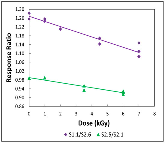 Figure 8 displays plots of response ratios S1.1/S2.6 and S2.5/S2.1 against radiation dose. The plots are quite linear—the correlation coefficients (r2) of first-order fitted curves are 0.932 and 0.931, respectively—and they do not exhibit response thresholds at low doses. The offset in the curves is a result of the differing lengths of the sensors. The negative slopes indicate that the longitudinal stresses on the wires in sensors S1.1 and S2.5 are being steadily relaxed with increasing dose and that these changes are persistent. (Recall that S2.6 and S2.1 are control units that were not irradiated.) The linearity of the plots suggests that doses of 7 kGy or less fall on the initial part of an extensive response curve. This is consistent with the results of Lappan et al. [46], who used 19F solid-state NMR and IR spectroscopy to investigate modifications in the chemical structure of PTFE induced by electron-beam irradiation in air at room temperature. Lappan et al. [46] found that the number-average molecular weight of the polymer decreased with dose to at least 4 MGy, and that the molecular weight dropped rapidly at low doses. In addition, they confirmed that chain scission was the predominant degradation process under their experimental conditions. As discussed in Section 2.2, the mechanical properties of PTFE are strongly dependent upon molecular weight and rapidly deteriorate with dose [40]. At doses higher than those employed here, it is anticipated that the response curves will display increasing nonlinearity. It should also be mentioned that the decreasing stresses may reflect radiation-induced compromise of the epoxy or of the adhesive joints between the wires and nylon screws.