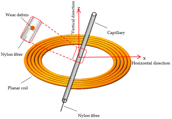 As shown in Figure 1, a planar coil is fabricated as a detecting inductor. The copper wire, having the diameter of 0.05 mm, was tightly wound around the steel core (1mm in diameter) with a fully automatic hot air winder (YZE-1200, Dongguan YinZhuoEn Precision Automation Co., Ltd., Dongguan, China). The specific parameters of the coil are as follows: wire diameter is 0.05 mm, inner diameter is 1 mm, outer diameter is 4 mm, the number of turns is 30, the number of layers is 3 and thickness is 0.15 mm. A transparent capillary (with inner diameter 0.1 mm and outer diameter 0.3 mm) was placed above the coil as flow channel for the wear debris. One end of the capillary was fixed on the micro-motion platform so that the relative position of the capillary to the inductor could be precisely adjusted. The initial position of capillary was located in the central of the coil with the help of the optical microscope (Nikon AZ100, Tokyo, Japan).