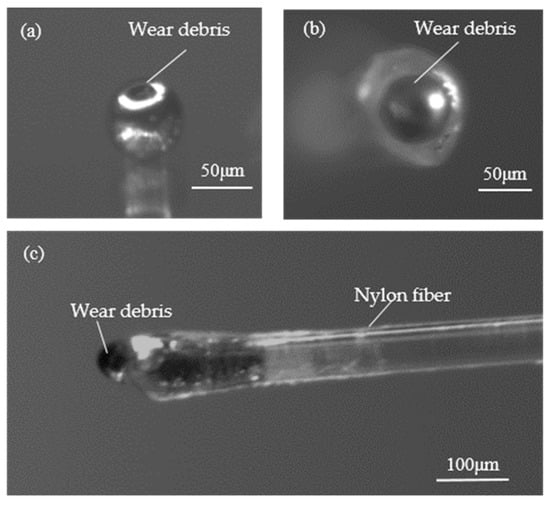 A 65 μm ferromagnetic wear debris fixed on the end of 80 μm nylon fiber. (a) Original wear debris; (b) The bottom view of fixed wear debris; (c) The side view of the fixed wear debris.
