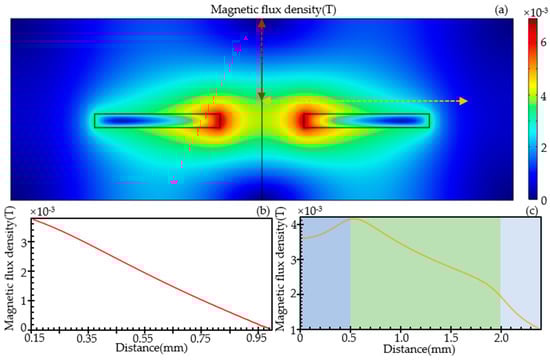 Two-dimensional modeling simulation of the magnetic field around the coil used by COMSOL software (COMSOL Multiphasic 5.3, COMSOL Inc., Stockholm, Sweden) is shown in Figure 3. The model parameters are consistent with the structure of the actual sensor (thickness, inner diameter, outer diameter, wire diameter, number of turns, AC frequency, and voltage). The excitation voltage and frequency were set to 2 V and 2 MHz. In the experiments, the wear debris pass through the capillary and the initial position is in the plane 0.15 mm far away from the coil. The magnetic flux density for the position wear debris would pass is shown in the Figure 3b,c. Based on the above model, it can be concluded that when the relative position of the wear debris to the inductive sensor is changed upward from the center height of 0.15 mm, the magnitude of the inductance change should be linearly reduced. When the relative position of the wear debris to the inductive sensor is changed outward from the center of the inductor, the magnitude of the inductance change should first increase and then decrease, and reach the maximum at the inner diameter edge.
