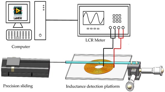 Three spherical iron particles with the diameter of 45 μm, 65 μm, and 82 μm separately are used in the experiment. As described in Section 2, these wear debris were attached on the free end of the nylon fiber. The other end of the nylon fiber was fixed on a precision sliding platform. The nylon fiber with the wear debris would move back and forth in the capillary. The experimental system diagram is shown in Figure 4. It consists of an inductive sensor, an inductance (L), capacitance (C), and resistance (R) meter (Agilent E4980A Precision LCR Meter, Agilent Technologies Inc., Bayan Lepas, Malaysia), a micro-motion platform, a precision sliding platform, and a computer. Precision sliding platform linearly pulls the nylon fiber at a steady speed of 30 mm/s. The capillary could be moved by the micro-motion platform so that the position of the wear debris pass can be adjusted precisely.