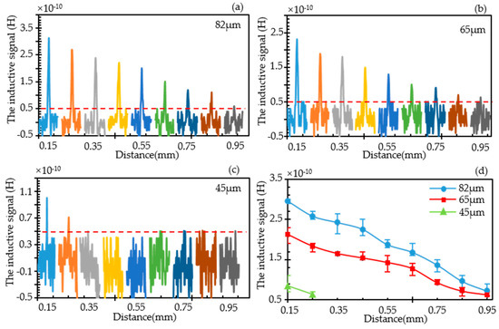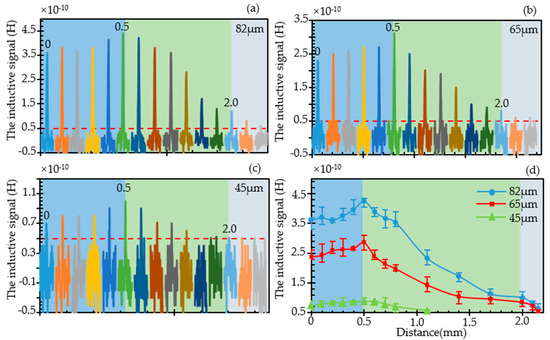 As shown in Figure 5a–c, the inductive pulse signal caused by the wear debris in different horizontal positions are extracted for 82 μm, 65 μm, and 45 μm, respectively. When no wear debris pass the inductor, the amplitude of the noise is nearly 0.5 × 10−10 H, and in consequence, this value is defined as the lower limit of detection. Fifteen positions were selected in the experiment, and the initial position is the midline of the inner diameter. The positions 0, 0.1, 0.2, 0.3, 0.4, 0.5, 0.6, 0.8, 1.1, 1.4, 1.7, 2, 2.1, 2.15 mm far from the midline were selected. These positions were divided into three groups, from midline to the edge of the inner diameter (shown in light blue shade), from the edge of the inner diameter to the edge of the outer diameter (shown in light green shade), and from the edge of the outer diameter to the external part of the inductor (shown in light grey shade).