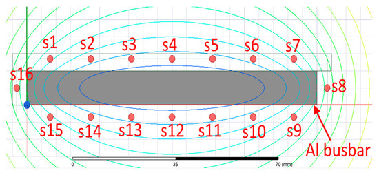 The tangential component of the magnetic field strength is calculated by FEM along the line at a distance 3.5 mm from the surface of the busbar for the unit measured current in the busbar. This line is divided into separate regions corresponding to each of 16 sensors. For calculating the weights for each sensor, the line integral corresponding of each section is calculated and divided by the magnetic field strength obtained by FEM for each sensor location.