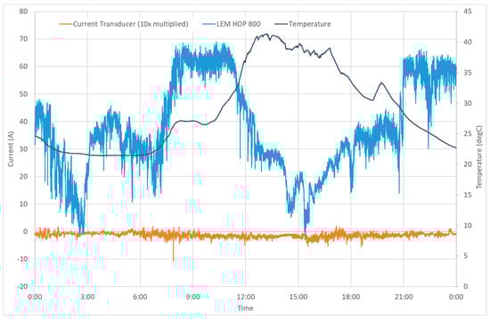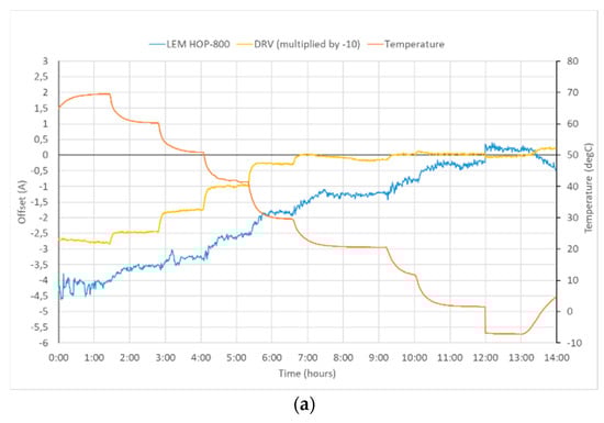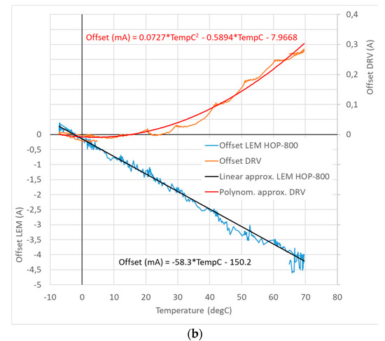 Offset drift was tested in the temperature range from −10 °C to +70 °C, which is the operation range of the LEM transducer. The offset of both sensors during the test is shown in Figure 3. While the LEM sensor has shown systematic temperature drift of 58 mA/°C, the offset of our sensor remained within 300 mA range for the whole temperature range (the offset is multiplied by −10 in Figure 3 for better comparison with offset of LEM HOP 800-SB sensor). The temperature offset drift of our sensor was changing between 8 mA/°C at 60 °C to −2 mA/°C between −10 °C and 0 °C.
