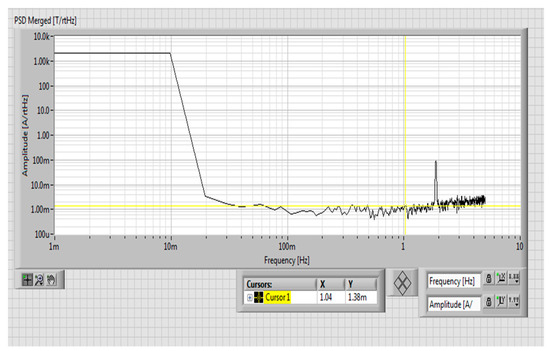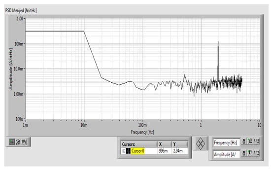 The noise spectrum of the novel yokeless transducer was calculated by using the LabVIEW software. The measured noise power spectrum density (PSD) is composed of two main components: the noise of the DAQ card and the noise of the transducer. PSD of the DAQ card itself equals to 1.38 mArms/√Hz at 1 Hz as shown in Figure 4, while total PSD (DAQ card + transducer) is 2.94 mArms/√Hz at 1 Hz as shown in Figure 5. From this we can estimate the noise of the transducer as √(2.942 − 1.382) = 2.6 mArms/√Hz at 1 Hz.