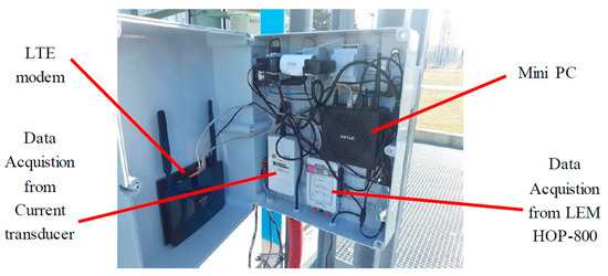 The autonomous measurement system for the current sensing in the neutral line of distribution transformers was designed (see Figure 11). The system consists of the mini PC Zotac ZBOX Nano with two data acquisition devices—USB-6210 and myDAQ, both from National Instruments (see Figure 12). The USB-6210 device acquires the data from all sixteen microfluxgates individually and myDAQ acquires the LEM sensor output. The digital data are online processed in the special software package developed in LabVIEW. All the measured and calculated data are stored on the SSD.